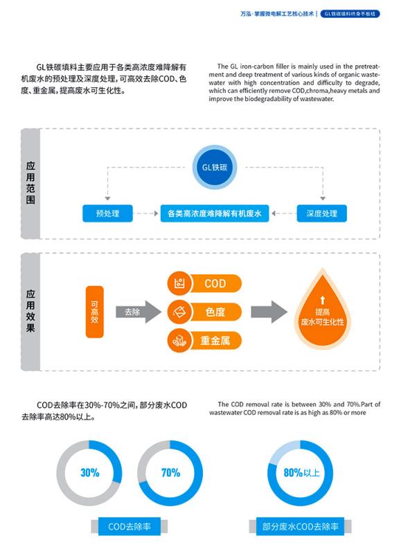 2、在微电解反应过程中,GL催化剂全程参与,杜绝长时间运行过程中由于铁的腐蚀出现的均流,及时剥离反应过程中生成的金属氧化物和氢氧化物膜,填料层层消耗、变小,阻止填料表面钝化板结,使整个处理过程高效、持久、稳定。